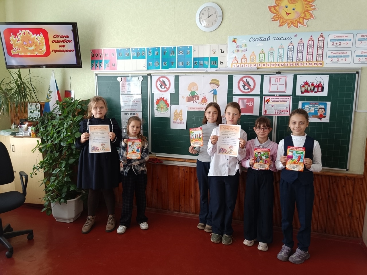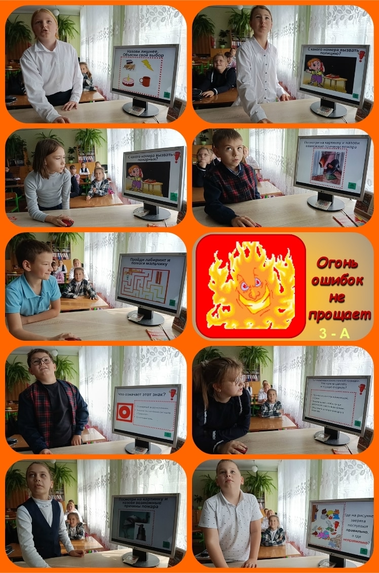 | 8 октября в 3 – А классе (классный руководитель Ревина О.Г.) прошёл воспитательный час в рамках Месячника по пожарной безопасности под названием «Огонь ошибок не прощает». Учащиеся ещё раз повторили основные правила поведения во время пожара, которые закрепили во время конкурсной интерактивной интеллектуальной игры между командами: «Искорки» (девочки) и «Огоньки» (мальчики). Отвечали на вопросы, разгадывали ребусы, узнавали отличительные знаки. Лучшие игроки – Фомина Алиса и Стецюра Артём были отмечены грамотами. Победила команда мальчиков. В конце мероприятия провели мини-экскурсию к школьному пожарному щиту. Дети получили поисковое домашнее задание – Почему вёдра на щите пожарной безопасности имеют форму конуса? #ПожарнаяБезопасность#БезопасностьДетей #ОсторожноОгонь #ПомниПравила #ПредотвратиПожар |