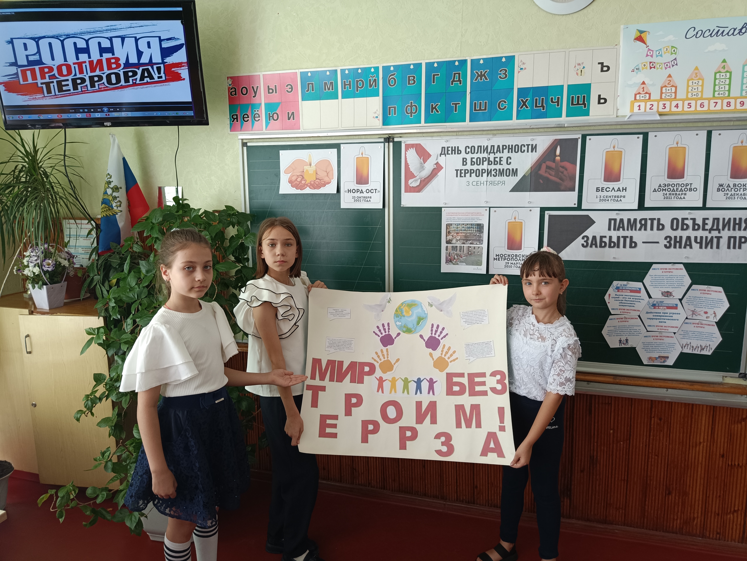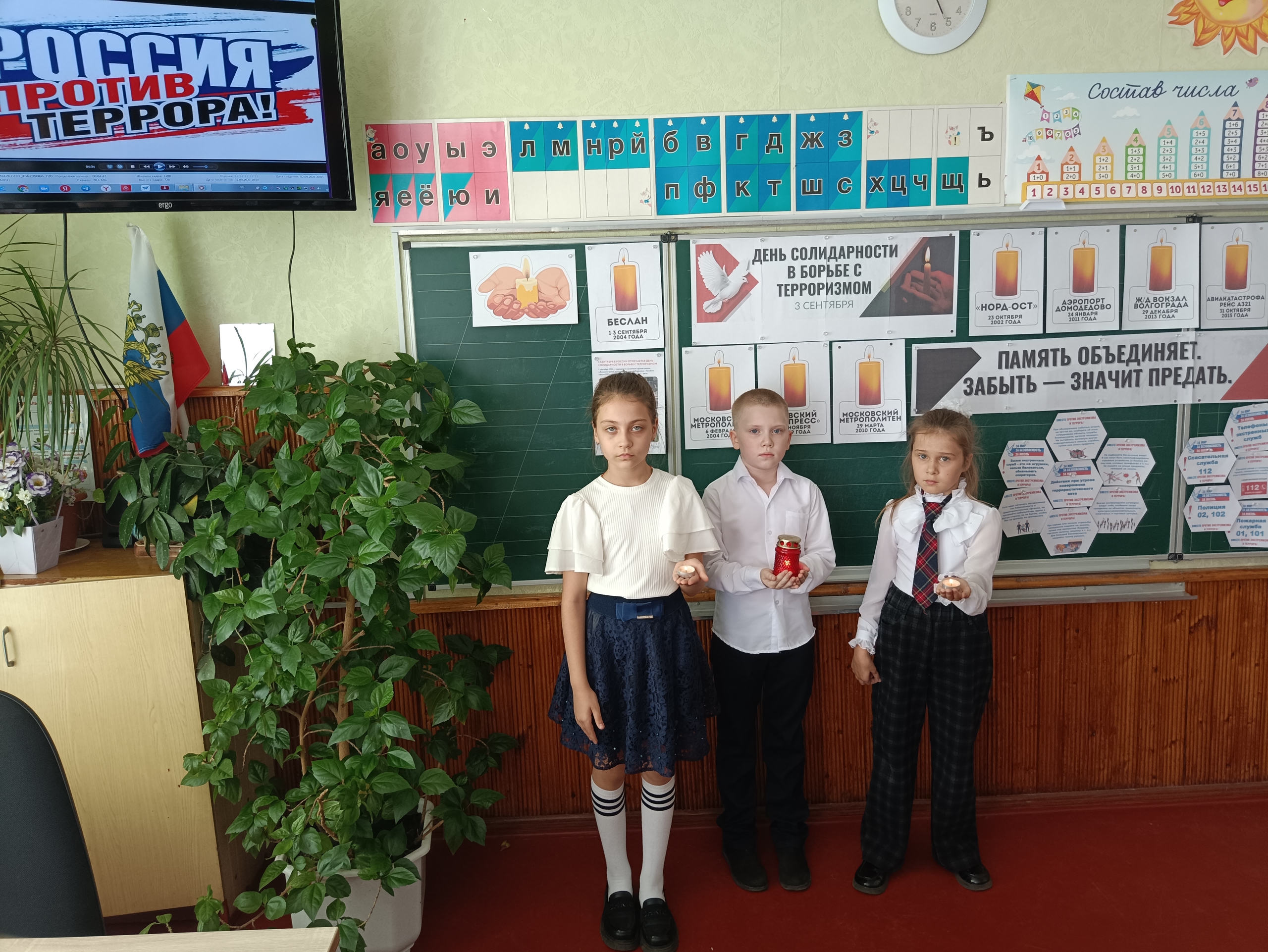 | Память объединяет. Забыть - значит предать! 3 сентября в 3 – А классе (классный руководитель Ревина Ольга Григорьевна) прошёл информационный классный час, посвящённый Дню солидарности в борьбе с терроризмом. Учащиеся узнали о страшном преступлении против жителей Северной Осетии. Посмотрели документальный фильм «Беслан, 2004»; вспомнили жертв других терактов, произошедших в разных точках России. Создали цветы из гексов по правилам поведения в случае нападения и взятия заложников. Итогом мероприятия стал выпуск газеты корреспондентами класса под названием «Мир без терроризма!» #терроризмугрозаобществу #антитеррор #терроризмунет #мыпомним #ДНР |