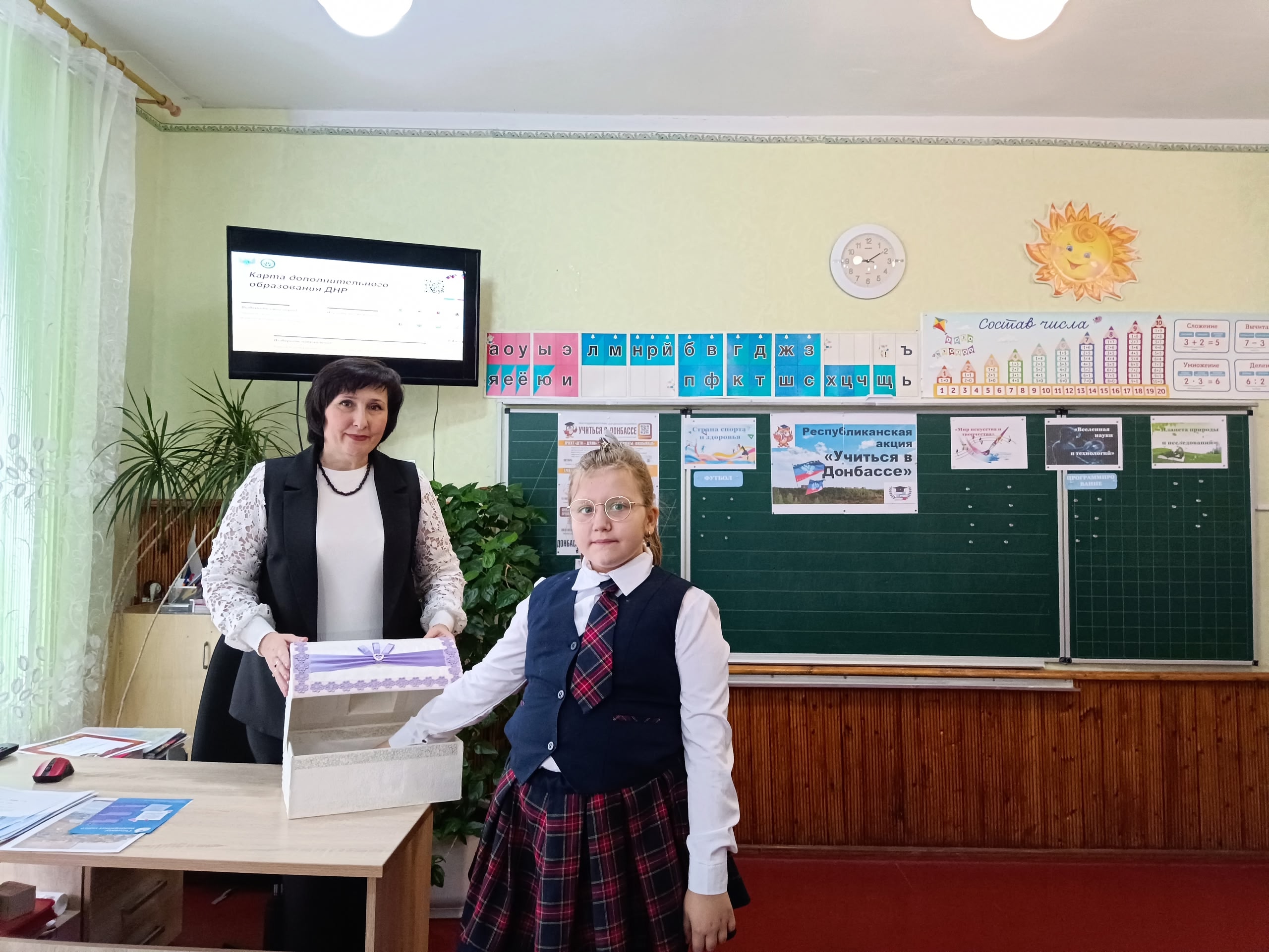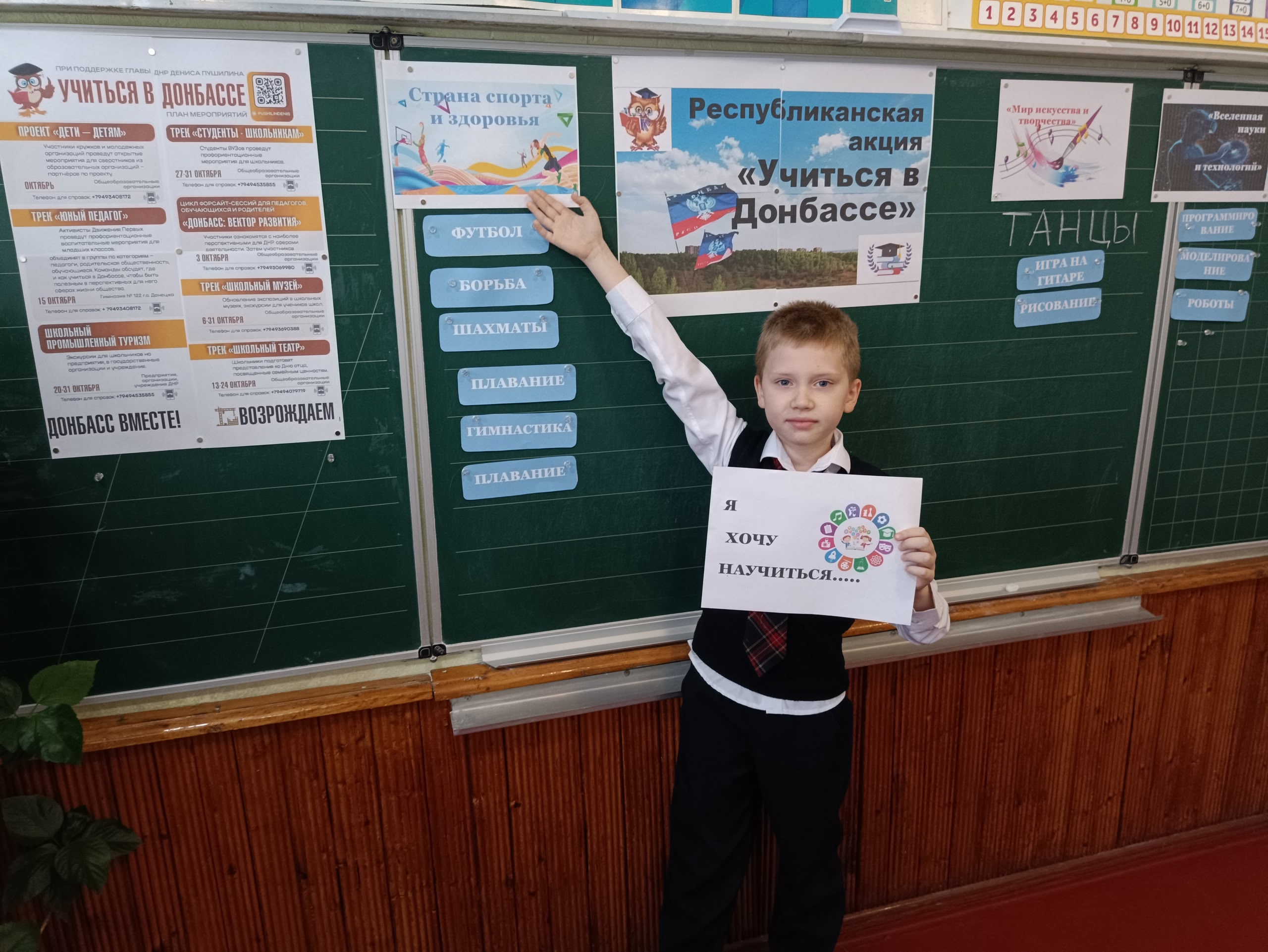 | 13 октября в 3 – А классе (классный руководитель Ревина Ольга Григорьевна) прошёл единый классный час в рамках Республиканской акции «Учиться в Донбассе» под названием «Карта дополнительного образования Республики: возможности рядом с тобой». Учащиеся рассказали, чем занимаются в свободное время после школы и на выходных. Наши футболисты – Боцан Артур, Стецюра Артём продемонстрировали свои спортивные достижения. Рудая Яна и Мельникова Мария показали презентацию, в которой показаны их победы в танцевальном батле. Участницы кружка «Палитра» - грамоты за творческие достижения. Игра «Волшебный сундук» помог разобраться ребятам какие же направления существуют в дополнительном образовании, какие возможности можно развивать в нашей школе и в городе Торезе. Дети заинтересовались и высказали свои мысли на рефлексии «Я хочу научиться…» #УчусьвДонбассе |